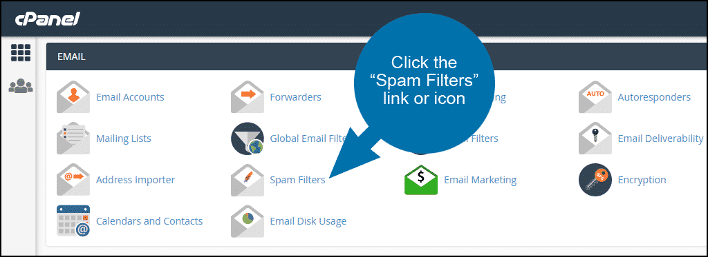 - Log in to cPanel. In the “Email” section, click the “Spam Filters” link or icon.